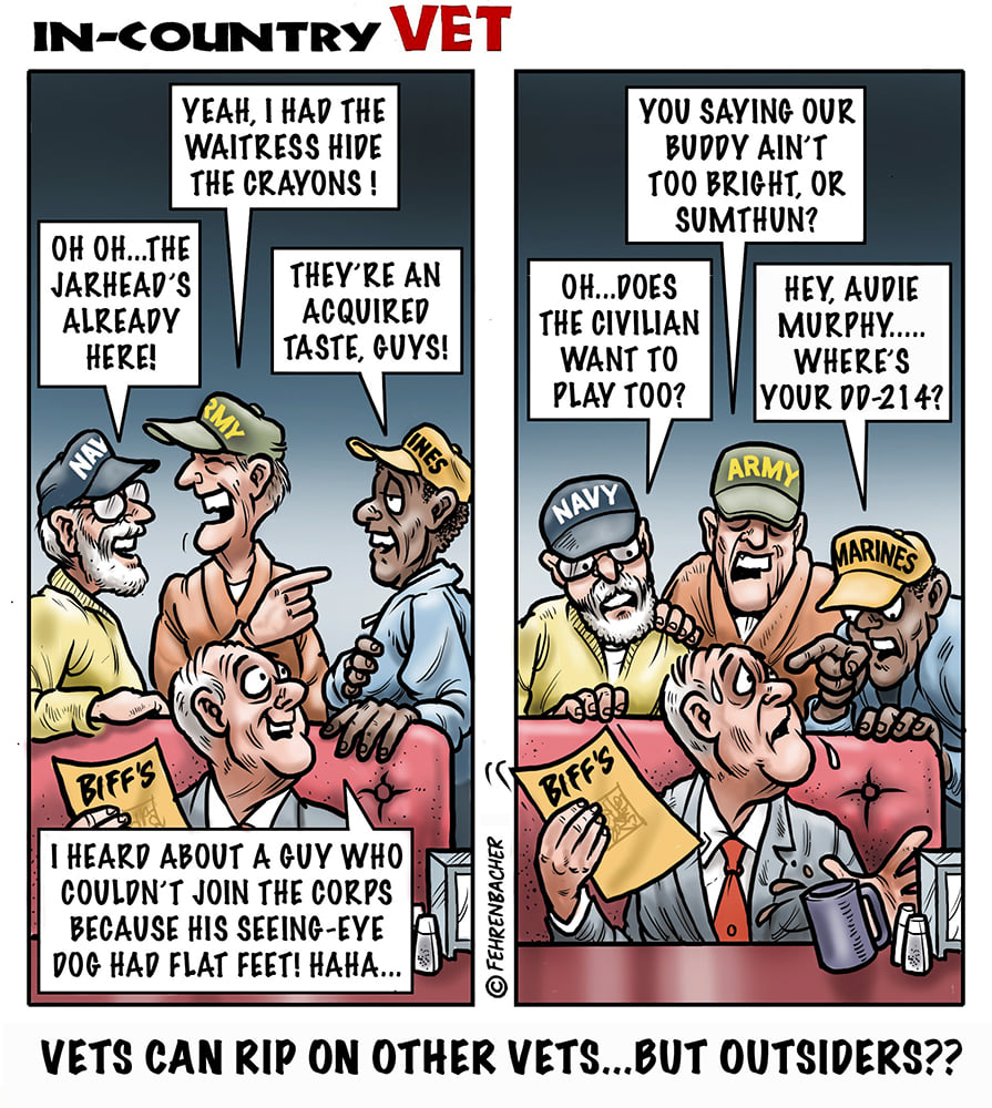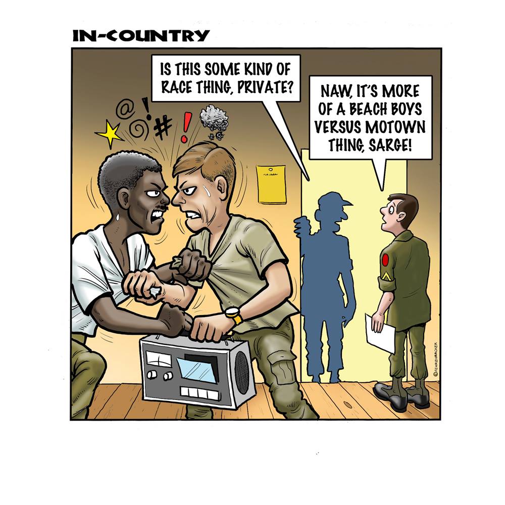 Phil enlisted in the Army in 1965 where he served for years in Vietnam. He became a graphic designer and has worked for the state of Oregon for 26 years. He retired in 2003 and started the Cartoon "In-Country". The cartoons reflect his experiences during his tour of duty in South Vietnam.